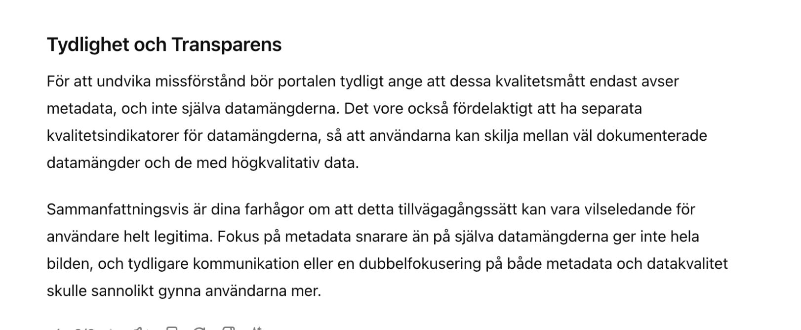 Ok @Andreas-Sundberg Ja, vi är medvetna om att det är svårt att förstå hur metadatakvalitet räknas ut, och vad man kan göra för att få upp resultatet. Det är fler som har påpekat det. Så du har helt rätt i att det behövs en insats från oss i att förtydliga det. Status är att frågan ligger i våran backlogg men att vi har varit tvungna att prioritera annat ett tag (bl.a. besvara mätningar från bl.a. både EU och OECD, remisser, uppstart av regeringsuppdrag mm). Och jag tror inte att det bara är en snabbfix som behöver göras kring MQA, utan antagligen ett lite större arbete. Vi skulle kunna bjuda in till ett möte om MQA för att reda lite mer i problembilden. Jag kan tyvärr inte säga exakt när det skulle kunna ske.