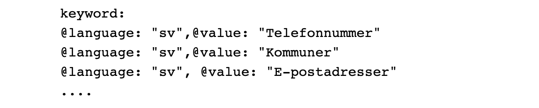 Snyggt exempel på Kunskapsgrafer vs. text strängar idag skickas datat vidare till Europeiska dataportal där svenska kommuner är en text sträng med en språklabel om jag förstått det rätt