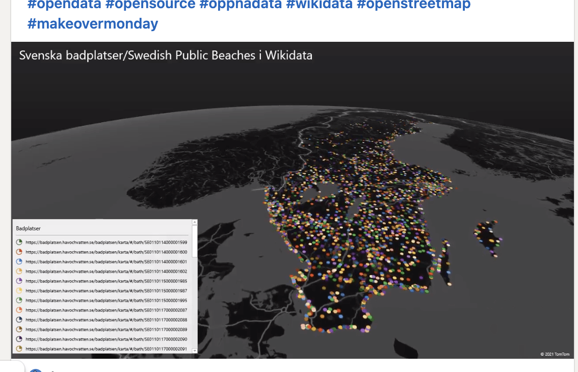 OT exempel hur datat hämtats av andra är att nu har data från WIkidata om svenska badplatser hämtats av en A Elias och visualiserats snyggt