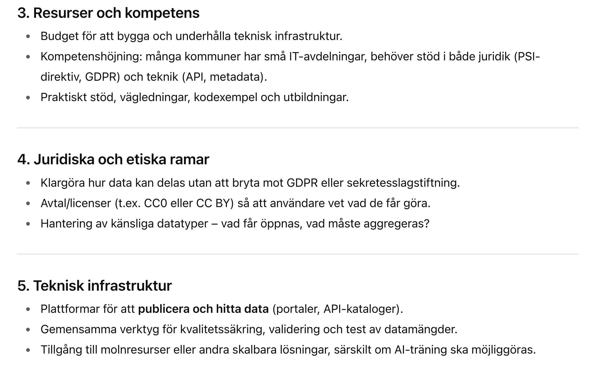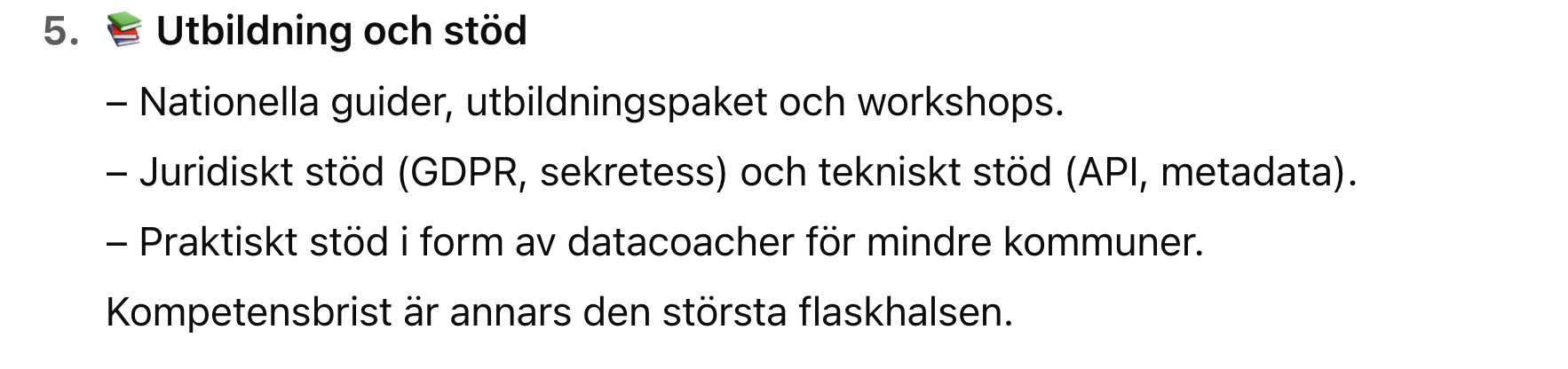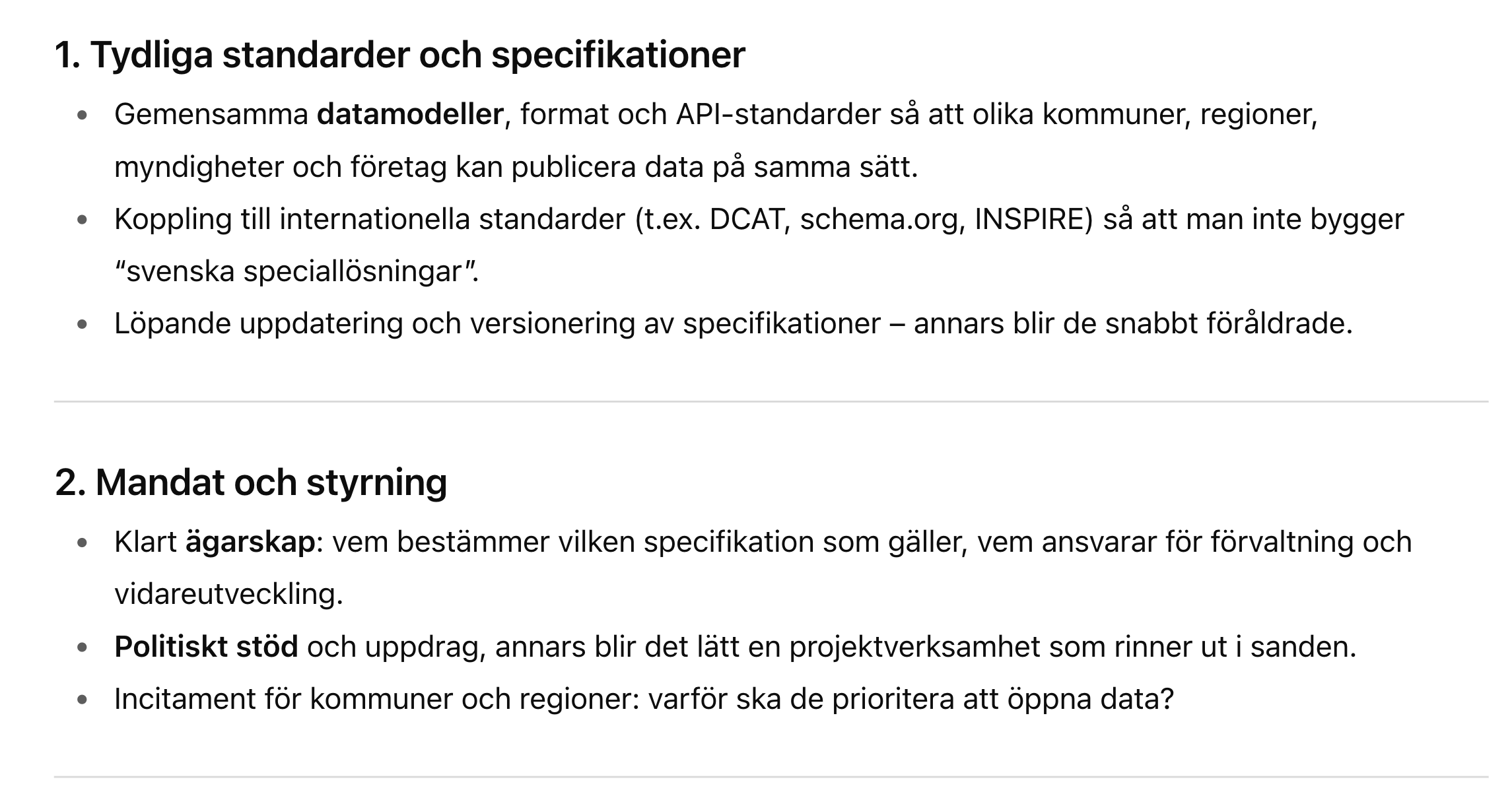 Buzzword / uttryck Frekvens / i vilka sammanhang Vad det signalerar / varför används Öppen data / öppna data återkommande i hela rapporten, t.ex. vid gemensamma karttjänster, specifikationer, stödinsatser. ([Internetstiftelsen][1]) Betoning på transparens, insyn, innovation — att data ska vara tillgänglig för många. Det är centralt för demokrati- och innovationsargument. Delbar data / delad data används ofta tillsammans med “öppen” eller i kontexten att undvika “silos”. ([Internetstiftelsen][1]) Signal att data inte ska ligga isolerat hos enskilda aktörer utan kunna utbytas och användas av flera. Interoperabilitet / interoperabla särskilt i delen “Månadens spaning – Data som grund för AI” och specifikationer. ([Internetstiftelsen][1]) Vikt för att system ska kunna “prata” med varandra — kommuner, regioner, myndigheter — samt för att AI-modeller ska kunna använda data från olika källor på ett sömlöst sätt. Specifikationer / gemensamma strukturer / datamodeller huvudområdet “Specificera”, listar många specifika datamängder som POI, skolinformation, etc. ([Internetstiftelsen][1]) Det pekar mot standardisering — att man vill att olika aktörer använder samma definitioner, format, modell för data så att återanvändning och kvalitet höjs. Samverkan återkommande när man beskriver partners, aktörer, referensgrupper, nätverk etc. ([Internetstiftelsen][1]) Betoning på att man inte gör detta ensam utan via samarbete mellan kommuner, regioner, myndigheter, privata aktörer. Viktigt för legitimitet, spridning, resurser. Stödja / stöd stödinsatser, verktyg, föredrag, nätverk, vägledningar. ([Internetstiftelsen][1]) Signal att fokus ligger inte bara på policy / strategi utan också att ge praktiskt stöd till aktörer som behöver hjälp att bli mer “datamogna”. Samordna “Samordna – omsätta i nytta och lärande” och liknande inslag. ([Internetstiftelsen][1]) Man vill inte bara skapa specifikationer och standarder utan också se till att det blir nytta och lärdom i praktiken. Nyckeltal för öppen data – tillgänglighet, användning, effekt, mognad nämns under samordna. ([Internetstiftelsen][1]) Man vill mäta — hur bra data fungerar, används, hur mogen aktören är vad gäller delning. Klimatdata nämns som ett potentiellt satsningsområde. ([Internetstiftelsen][1]) Indikerar att rapporten vill koppla data-/öppen data-agendan till större samhällsutmaningar som klimatkrisen. AI / “Data som grund för AI” i spaningen — hur AI kräver öppen/-delbar/-interoperabel data. ([Internetstiftelsen][1]) Ett styrande tema: AI används som ett argument för varför data måste vara tillgängligt, bra strukturerat etc. Det ger hög relevans och tryck för att agera. [1]: https://internetstiftelsen.se/dataverkstaden/aktuellt/lagesrapport-for-den-nationella-dataverkstaden-september-2025/ "Lägesrapport för den nationella dataverkstaden, september 2025 Internetstiftelsen" Vad behövs för att detta skall fungera