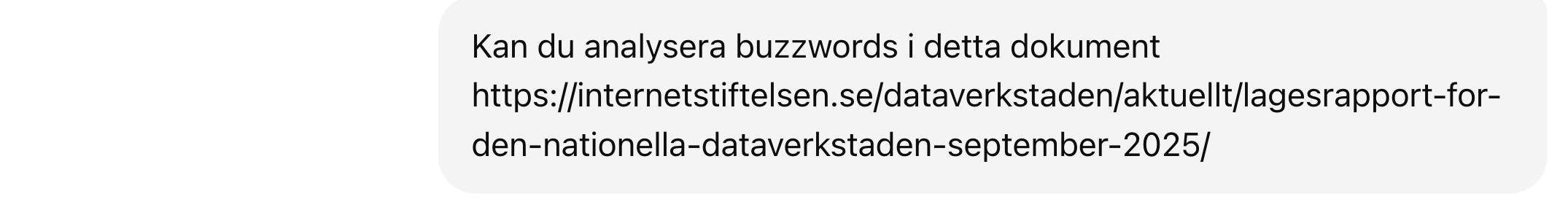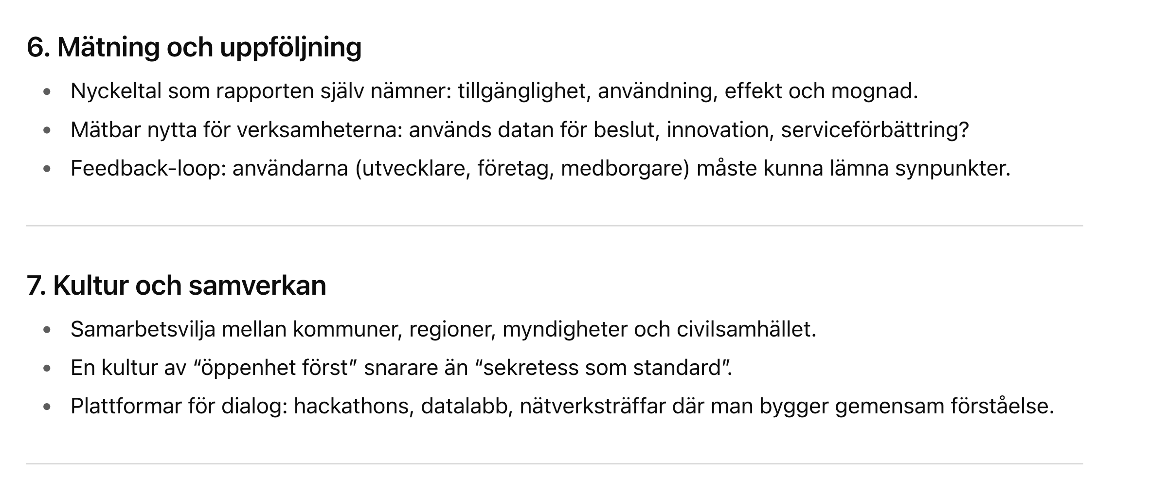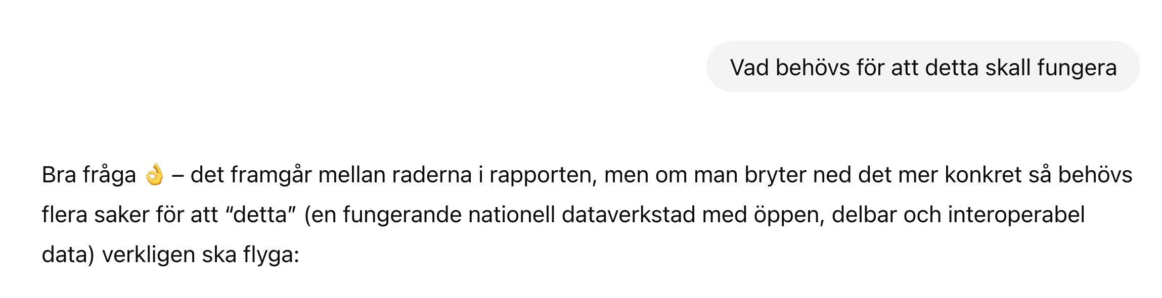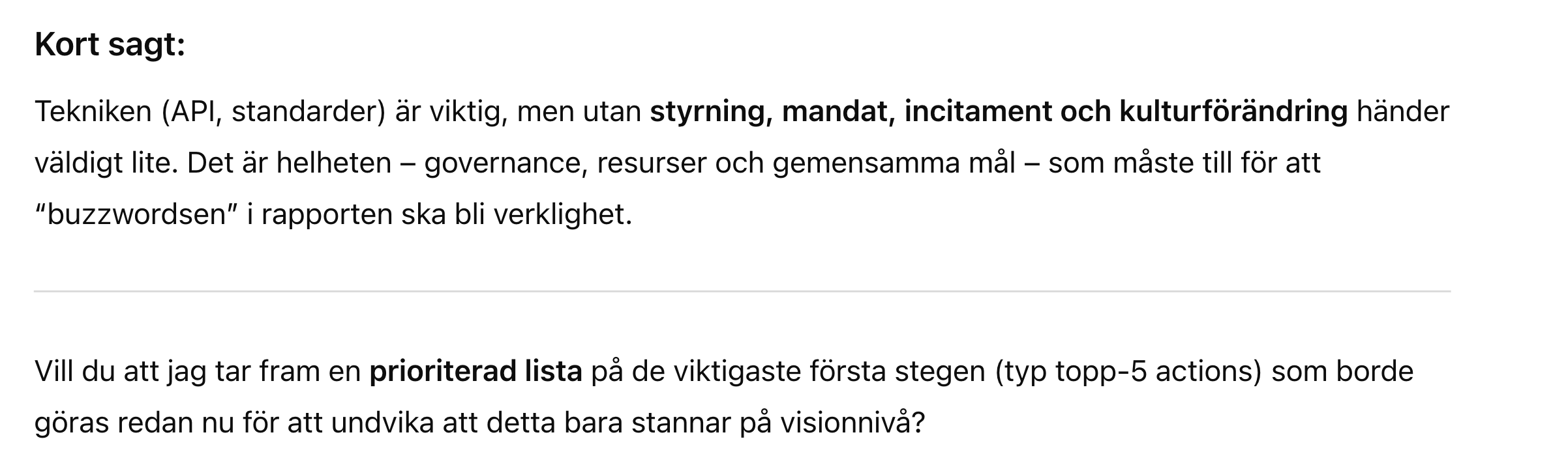 Buzzword / uttryck Frekvens / i vilka sammanhang Vad det signalerar / varför används Öppen data / öppna data återkommande i hela rapporten, t.ex. vid gemensamma karttjänster, specifikationer, stödinsatser. ([Internetstiftelsen][1]) Betoning på transparens, insyn, innovation — att data ska vara tillgänglig för många. Det är centralt för demokrati- och innovationsargument. Delbar data / delad data används ofta tillsammans med “öppen” eller i kontexten att undvika “silos”. ([Internetstiftelsen][1]) Signal att data inte ska ligga isolerat hos enskilda aktörer utan kunna utbytas och användas av flera. Interoperabilitet / interoperabla särskilt i delen “Månadens spaning – Data som grund för AI” och specifikationer. ([Internetstiftelsen][1]) Vikt för att system ska kunna “prata” med varandra — kommuner, regioner, myndigheter — samt för att AI-modeller ska kunna använda data från olika källor på ett sömlöst sätt. Specifikationer / gemensamma strukturer / datamodeller huvudområdet “Specificera”, listar många specifika datamängder som POI, skolinformation, etc. ([Internetstiftelsen][1]) Det pekar mot standardisering — att man vill att olika aktörer använder samma definitioner, format, modell för data så att återanvändning och kvalitet höjs. Samverkan återkommande när man beskriver partners, aktörer, referensgrupper, nätverk etc. ([Internetstiftelsen][1]) Betoning på att man inte gör detta ensam utan via samarbete mellan kommuner, regioner, myndigheter, privata aktörer. Viktigt för legitimitet, spridning, resurser. Stödja / stöd stödinsatser, verktyg, föredrag, nätverk, vägledningar. ([Internetstiftelsen][1]) Signal att fokus ligger inte bara på policy / strategi utan också att ge praktiskt stöd till aktörer som behöver hjälp att bli mer “datamogna”. Samordna “Samordna – omsätta i nytta och lärande” och liknande inslag. ([Internetstiftelsen][1]) Man vill inte bara skapa specifikationer och standarder utan också se till att det blir nytta och lärdom i praktiken. Nyckeltal för öppen data – tillgänglighet, användning, effekt, mognad nämns under samordna. ([Internetstiftelsen][1]) Man vill mäta — hur bra data fungerar, används, hur mogen aktören är vad gäller delning. Klimatdata nämns som ett potentiellt satsningsområde. ([Internetstiftelsen][1]) Indikerar att rapporten vill koppla data-/öppen data-agendan till större samhällsutmaningar som klimatkrisen. AI / “Data som grund för AI” i spaningen — hur AI kräver öppen/-delbar/-interoperabel data. ([Internetstiftelsen][1]) Ett styrande tema: AI används som ett argument för varför data måste vara tillgängligt, bra strukturerat etc. Det ger hög relevans och tryck för att agera. [1]: https://internetstiftelsen.se/dataverkstaden/aktuellt/lagesrapport-for-den-nationella-dataverkstaden-september-2025/ "Lägesrapport för den nationella dataverkstaden, september 2025 Internetstiftelsen" Vad behövs för att detta skall fungera