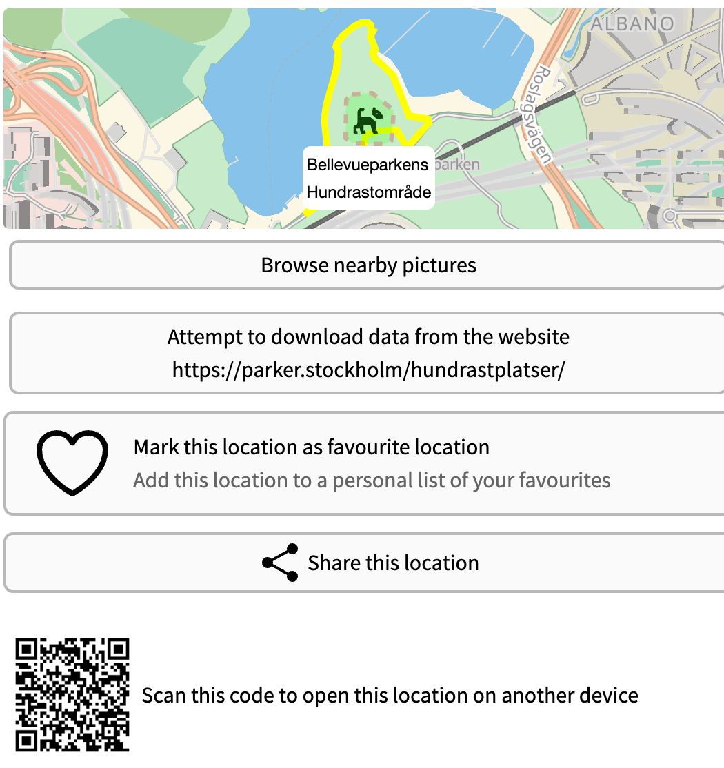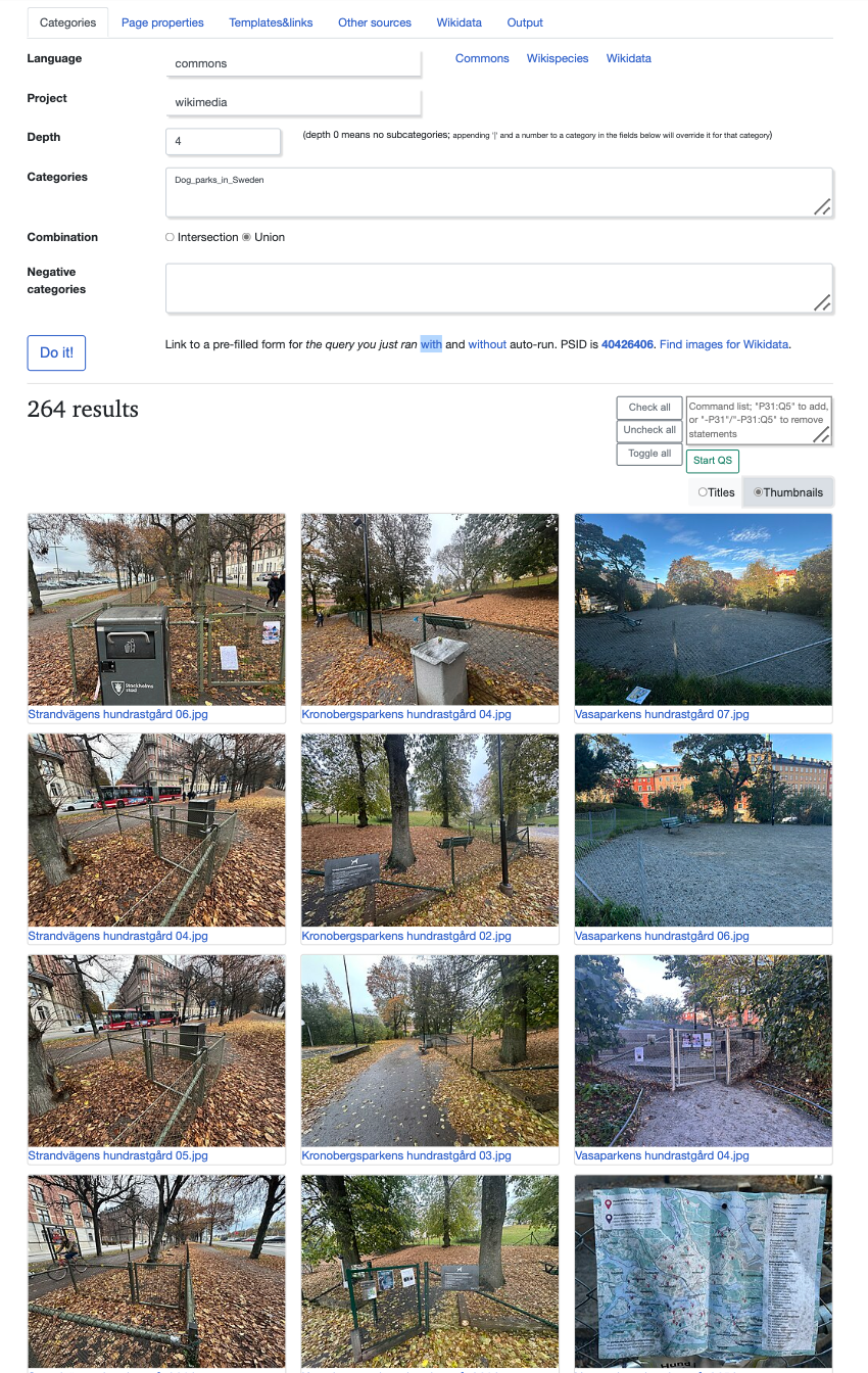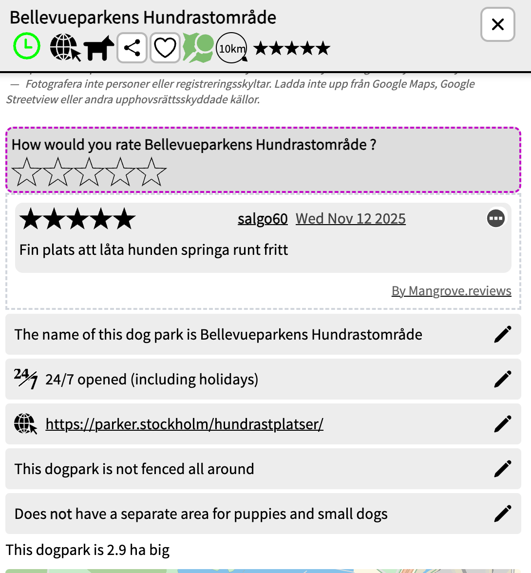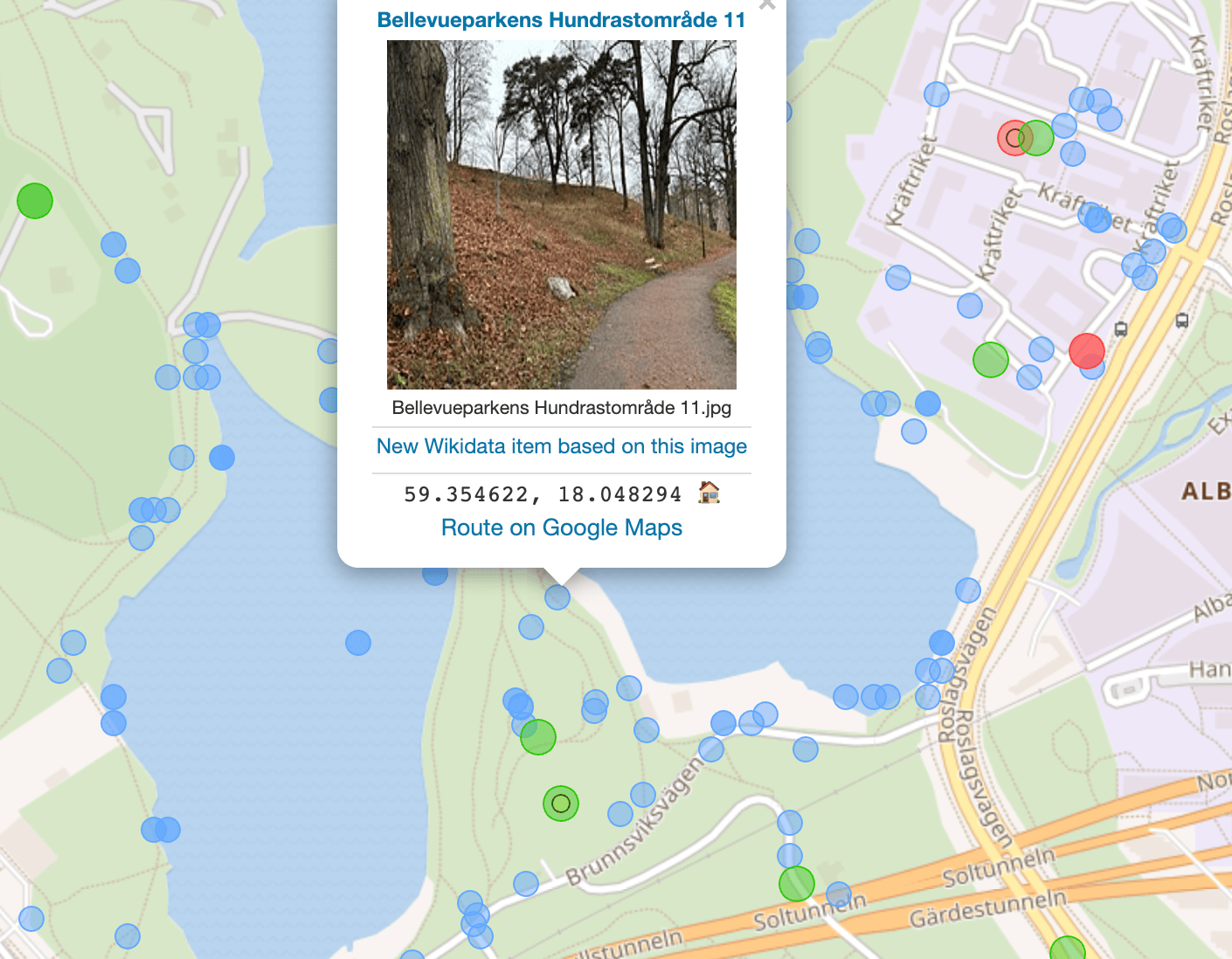 - Wikishootme visar alla bilder på wikicomkons och objekt ex. Bellevueparkens Hundrastområde där jag vandrade idag