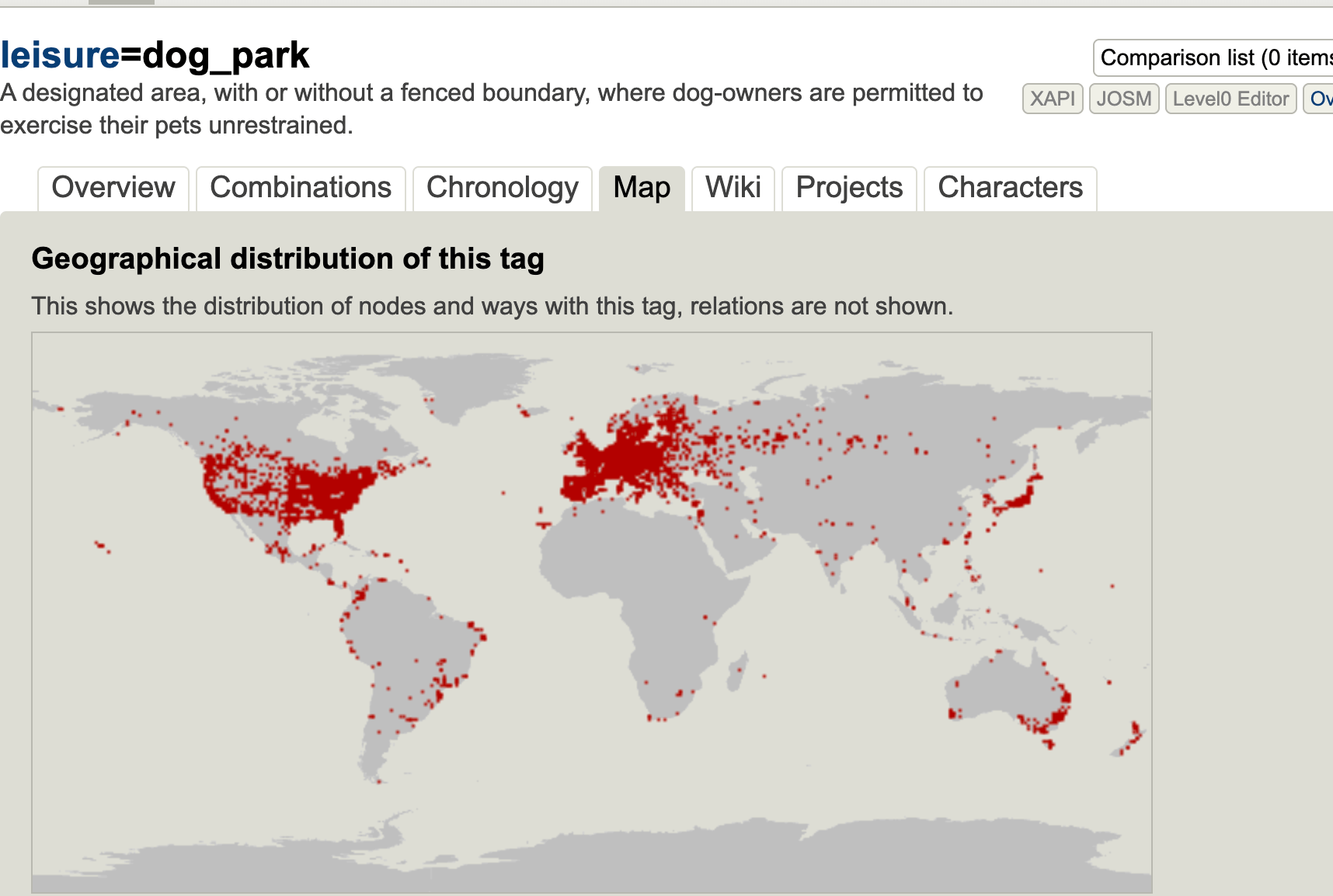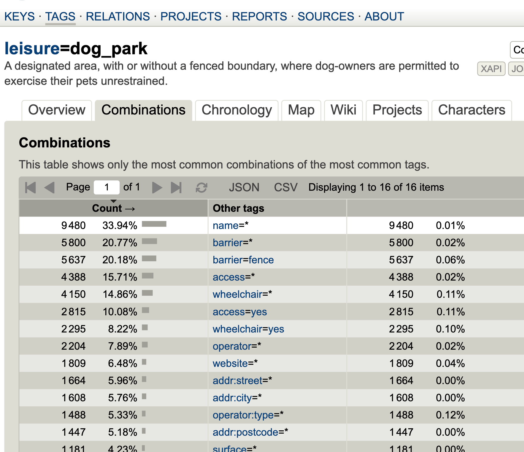 På tag_info kan du se vilka taggar som används ihop med leisure=dog_park#combinations