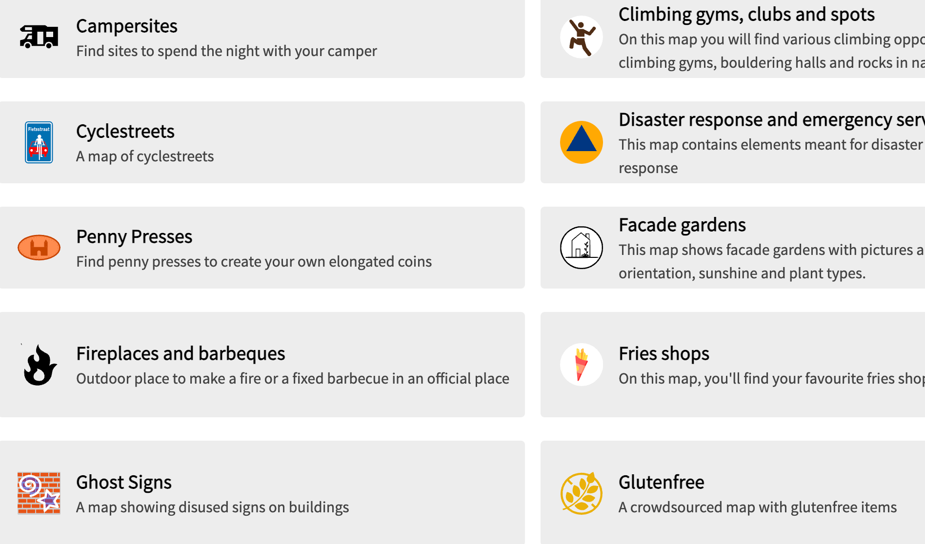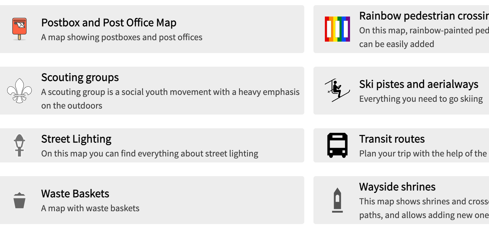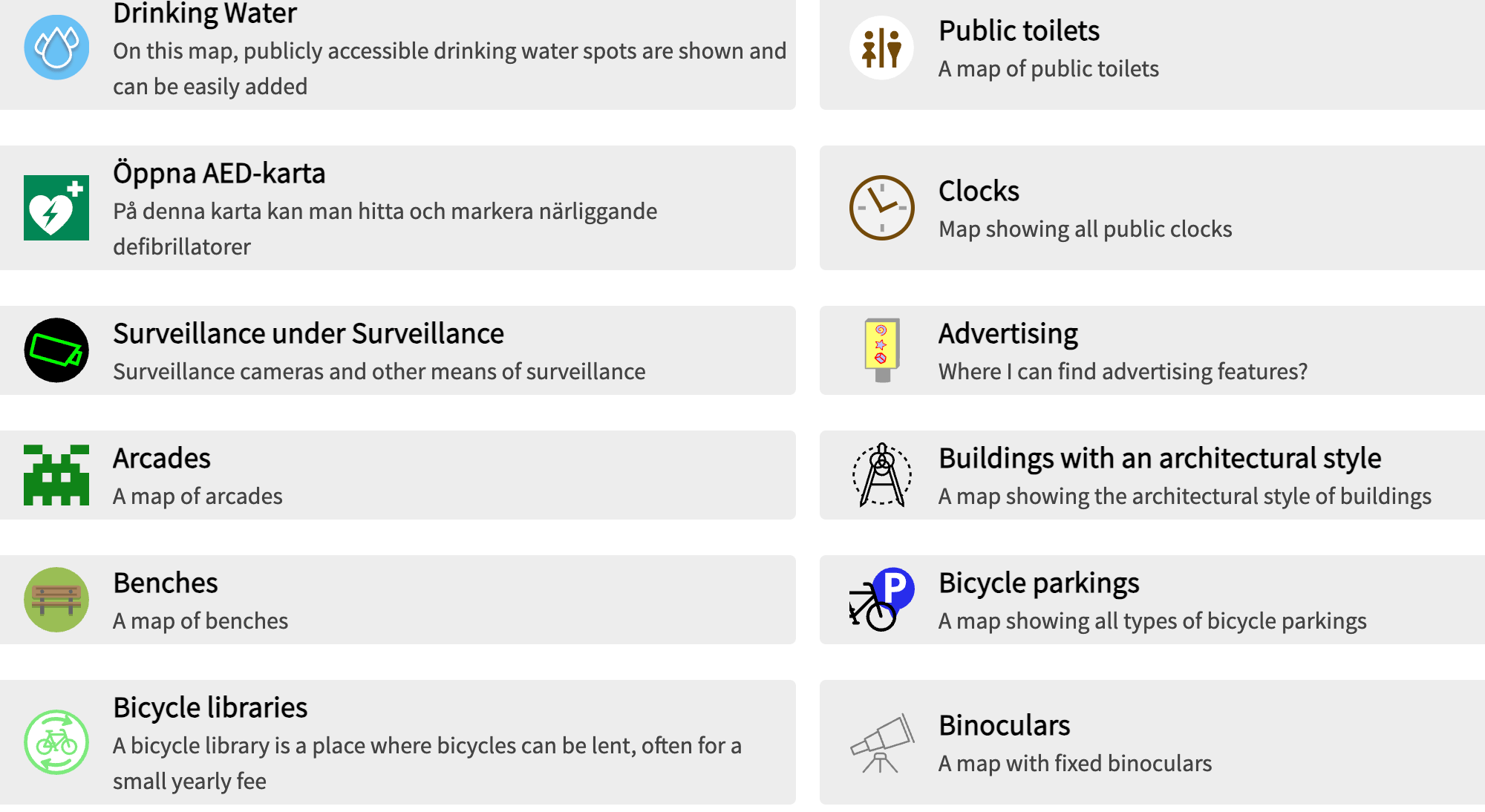 - MapComplete - spånnande koncept med teman där man kan skapa nya teman som "ställer frågor" om egenskaper som saknas