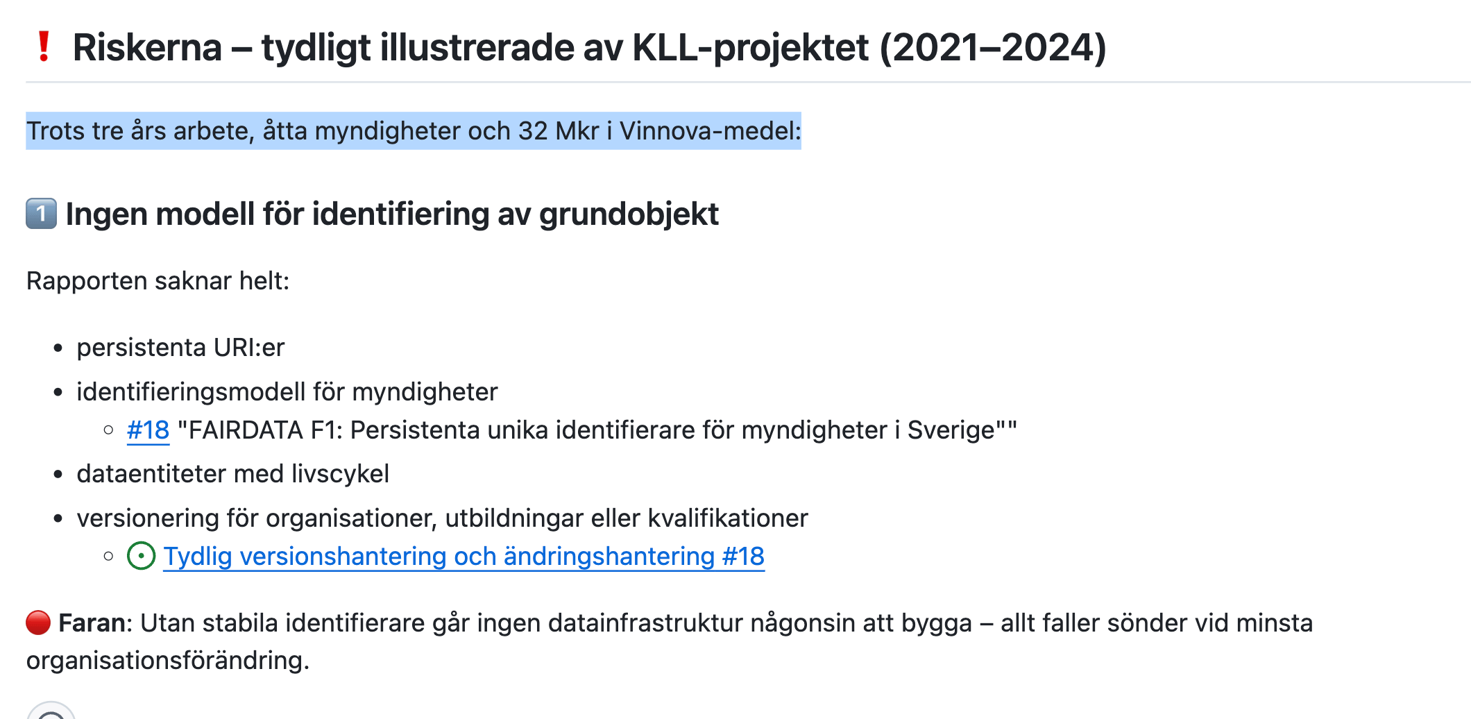 KLL-utredningen (8 myndigheter, 32 Mkr, 3 år) lyckades inte heller landa detta, trots att det borde varit prio 1 för all datadelning.