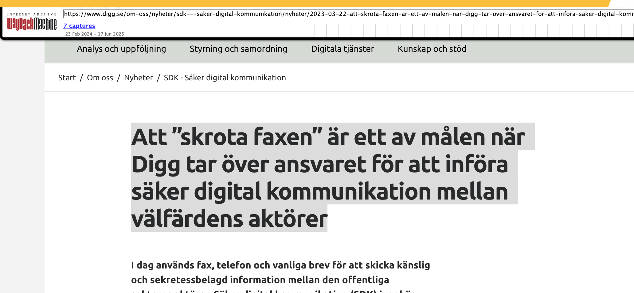 Kollar länkröta och hittar denna artikel "Att ”skrota faxen” är ett av målen när Digg tar över ansvaret för att införa säker digital kommunikation mellan välfärdens aktörer"