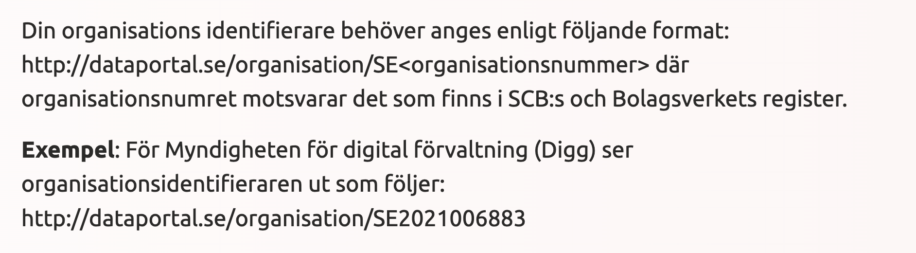 - Organisationsnummer används som pseudo-PID Organisationsnummer är en identifierare för en juridisk person, inte en persistent digital identifierare (PID) för en myndighet som informationsobjekt. Samma problem syns även i dataportalen, t.ex. kring dcterms:publisher (se diskussion här). I praktiken borde en myndighet identifieras via en stabil PID som pekar på myndighetsregistret, inte via organisationsnummer ( alla ambassader som äf i registret har inga organisationsnummer, även massa felaktigt data)