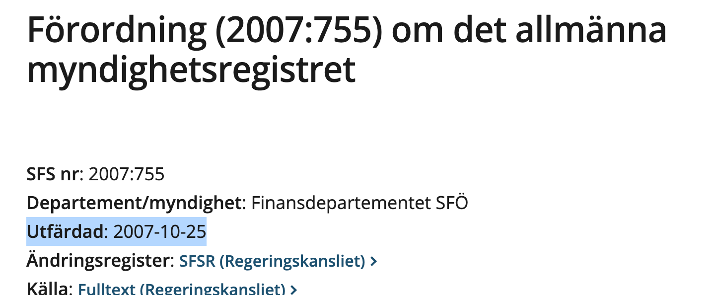 I SFS 2007:755 – Förordning om det allmänna myndighetsregistret