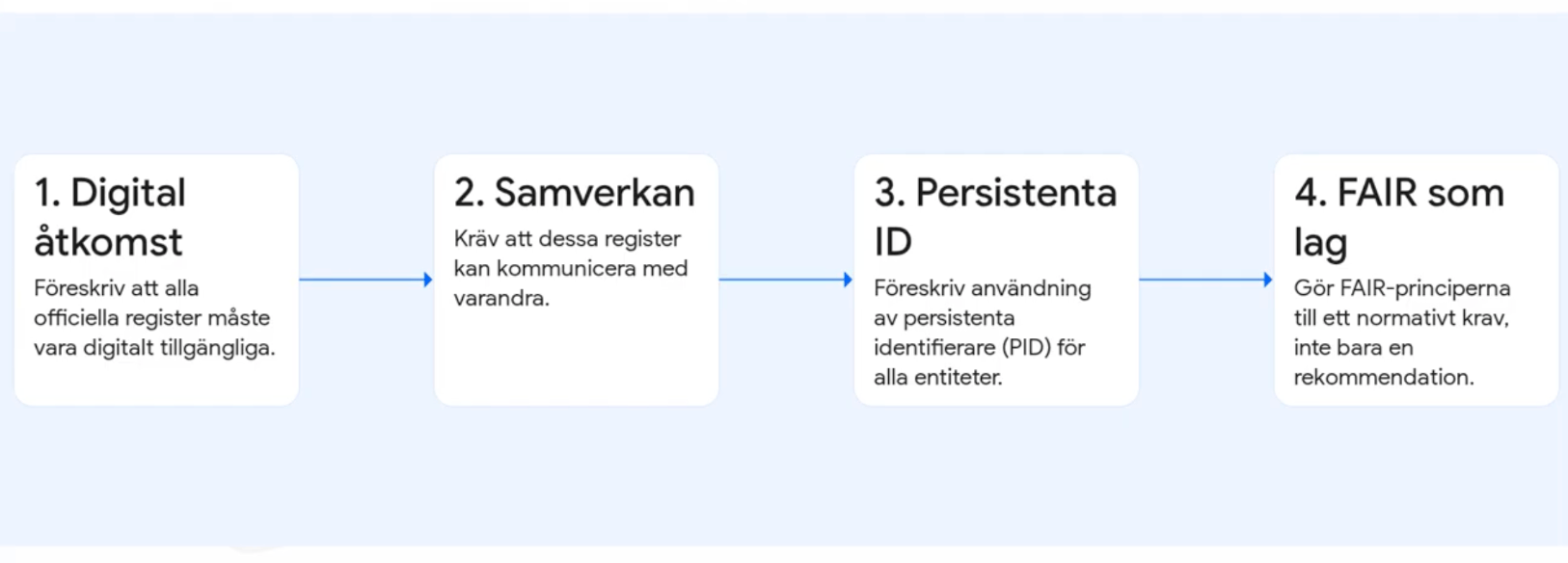 - informationen är inte FAIR Utan persistenta identifierare, maskinläsbar semantik och interoperabla begrepp kan registret varken bli fullt Findable, Accessible, Interoperable eller Reusable (se https://en.wikipedia.org/wiki/FAIR_data)
