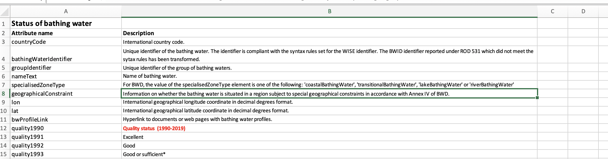 Eionet Data Dictionary innehåller termen bathingWaterIdentifier = dataelements/99263