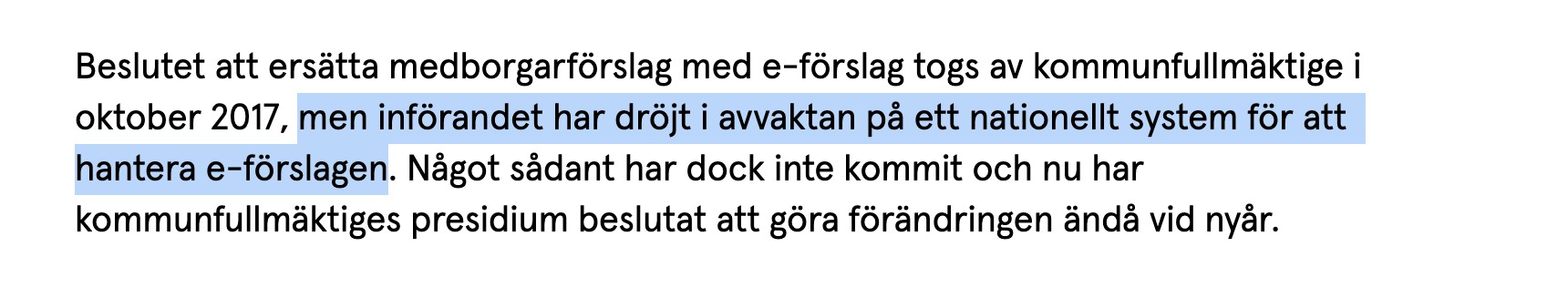 " men införandet har dröjt i avvaktan på ett nationellt system för att hantera e-förslagen"