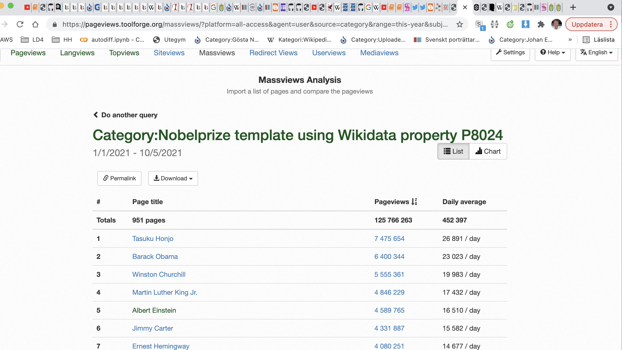 --> att vi i WIkivärlden som har bara på engelsk WIkipedia > 452 tusen dagliga visningar av Nobelpristagare (125 milj/år) kan nu matcha detta automatiskt och sedan har vi många av hans senast publicerade dokument och visar upp det i Scholia som är ett lager på Wikidata --> länk scholia Q5237001 eftersom api.nobelprize.org API:et är nivå 5 se 5stardata.info/ och inte strings utan things blir detta möjligt med ex. co-authors se SPARQL fråga