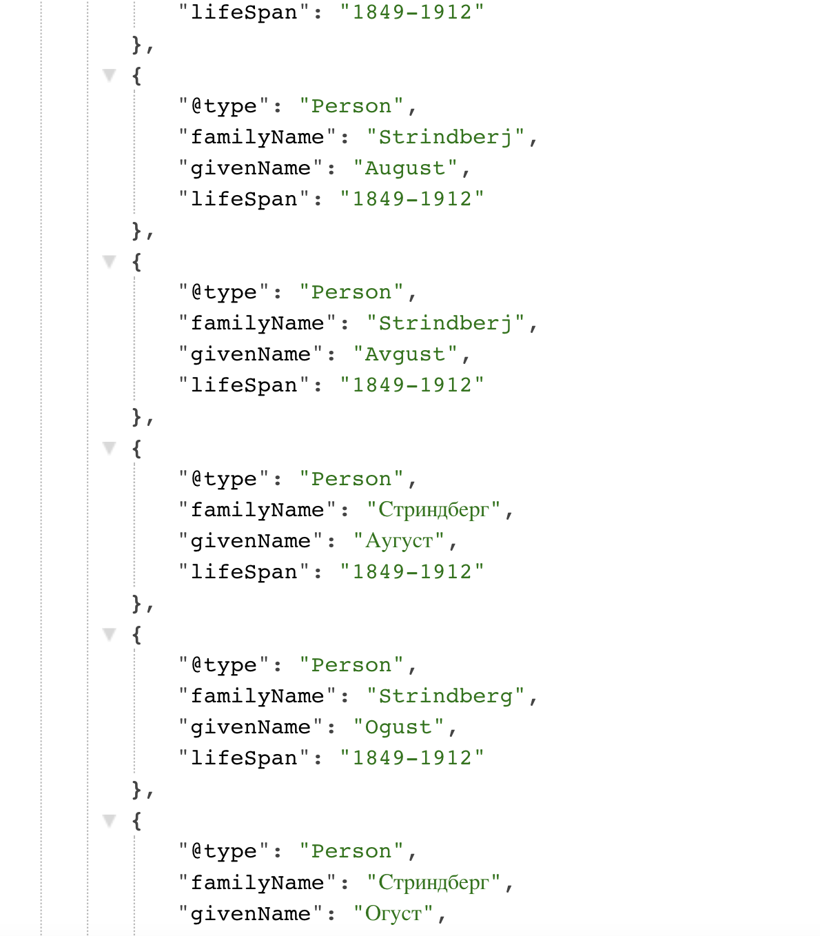 KB verkar ha gjort tvärtom har alla varianter i sitt data ex. August Strindberg JSON-LD där August finns på massa olika språk men man får gissa vilket.... livet med en teknisk skuld och gammalt data som inte städats....