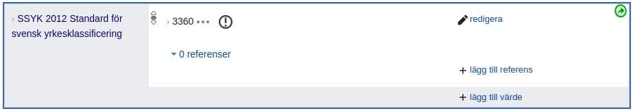 Ja egenskapen är själva nyckeln. Så på till exempel objektet polis (Q384593) kan man i egenskapen SSYK 2012 Standard för svensk yrkesklassificering (P8654) ange värdet 3360 så här.