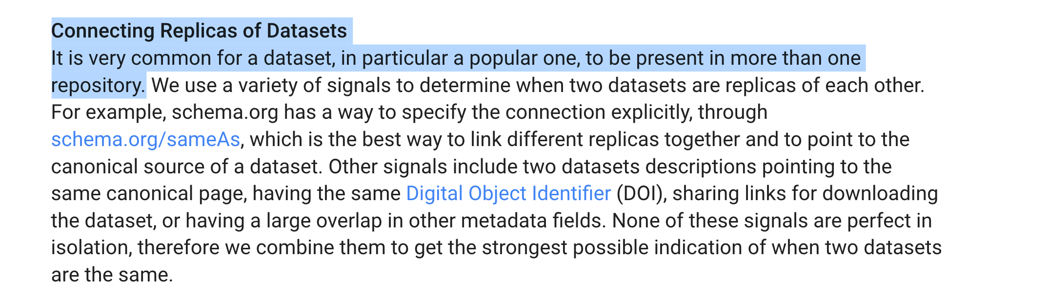 dvs. det som beskrivs i "Building Google Dataset Search and Fostering an Open Data Ecosystem" - It is very common for a dataset, in particular a popular one, to be present in more than one repository.