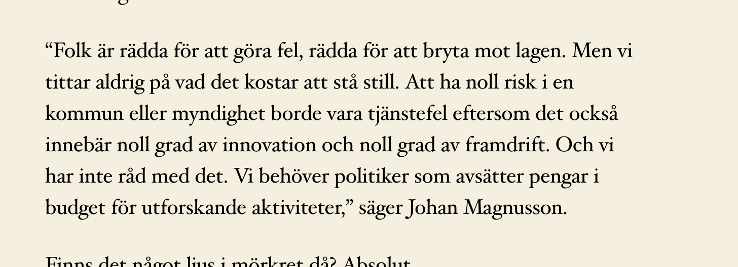 - I wikivärlden säger man be bold i podcasten "#250 – “Jag blir frustrerad över att folk inte har panik” frågar Johan Magnusson retoriskt vad är kostnaden att stå still och inte våga