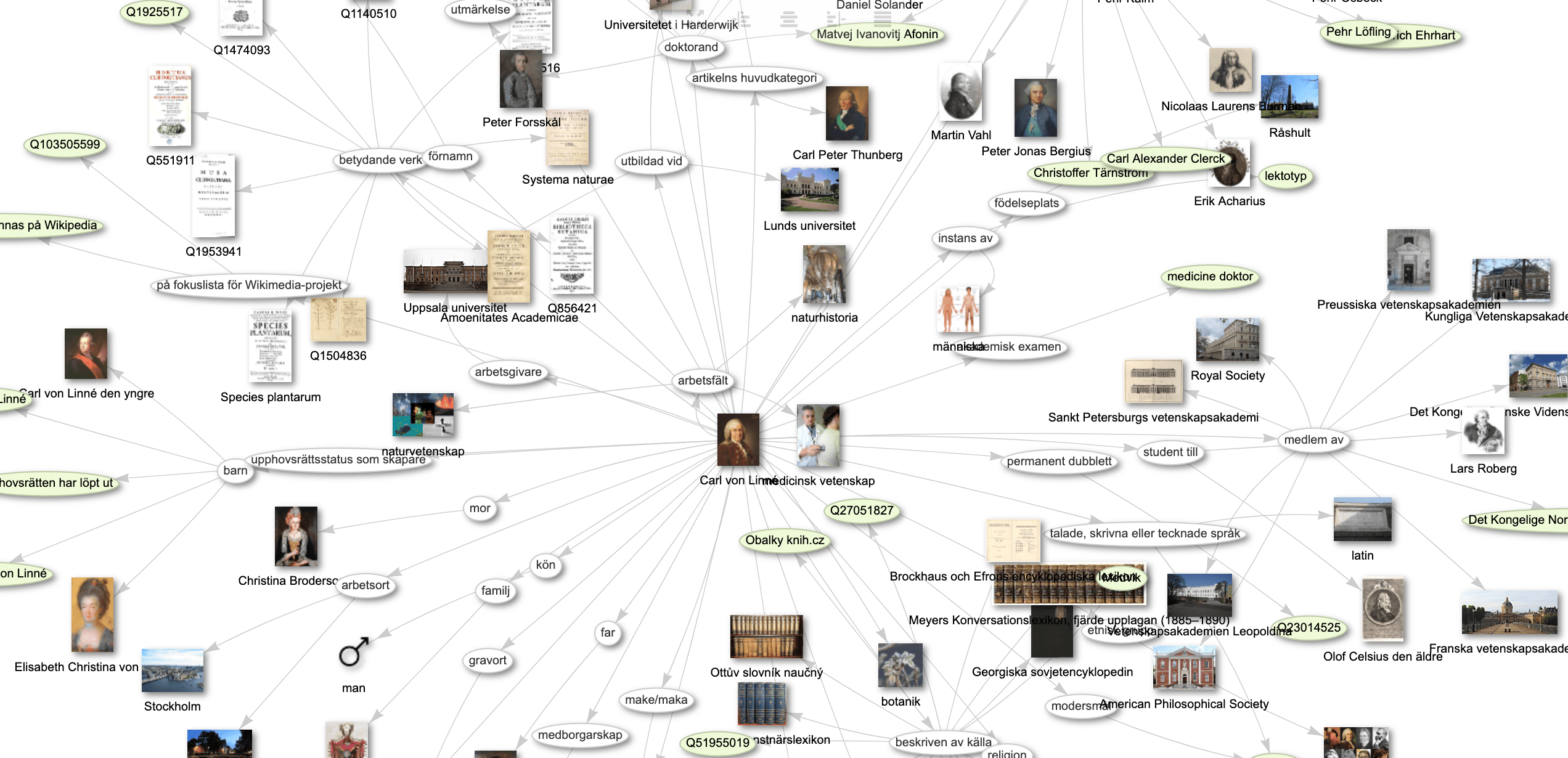 Exempel Qnummer som nyckel: Bionomia Q1043 är samma gubbe som Wikidata Q1043 - hans graf