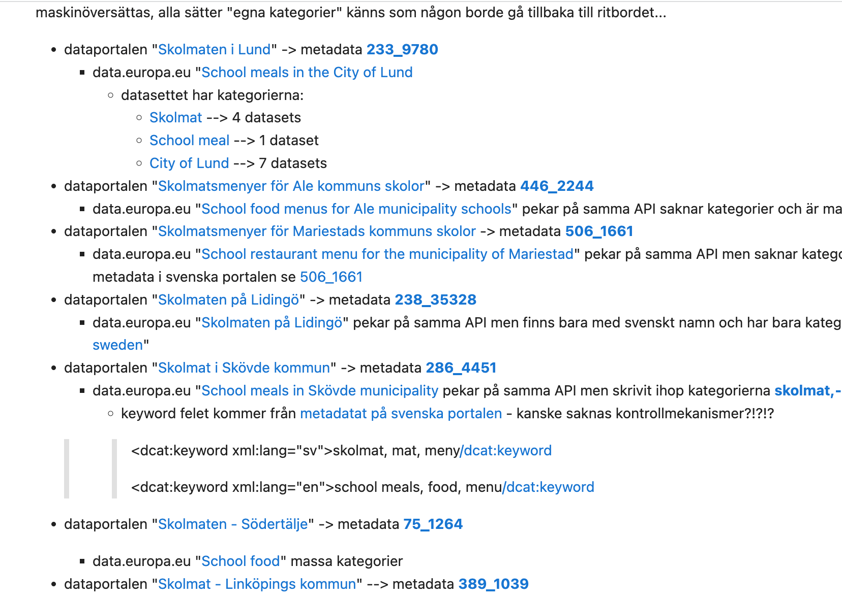 - varje kommun verkar rekommenderas att ladda upp sitt data om skolmåltider på portalen --> jag ifrågasätter om det är sunt... när det finns ett API så blir det bara en röra
