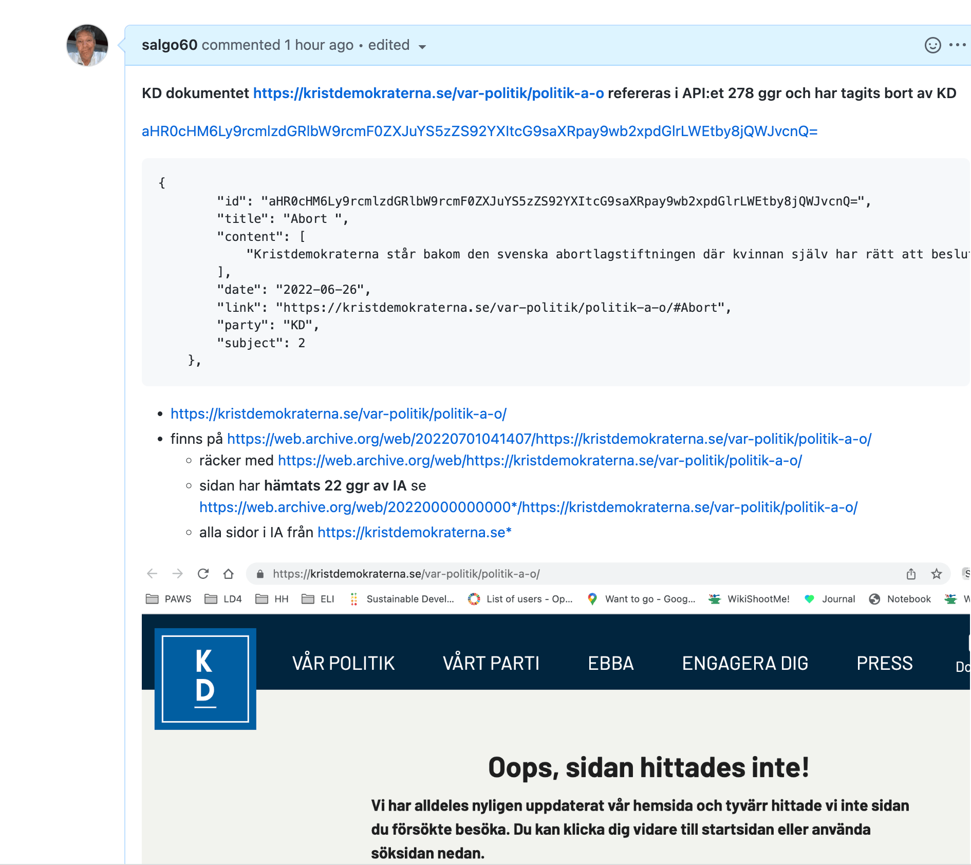 Vi sparar undan vad partierna lovar till Internet Archive och hittar nu att KD flyttar runt sina sidor med vallöften.... se GITHUB partiguiden/issues/1306