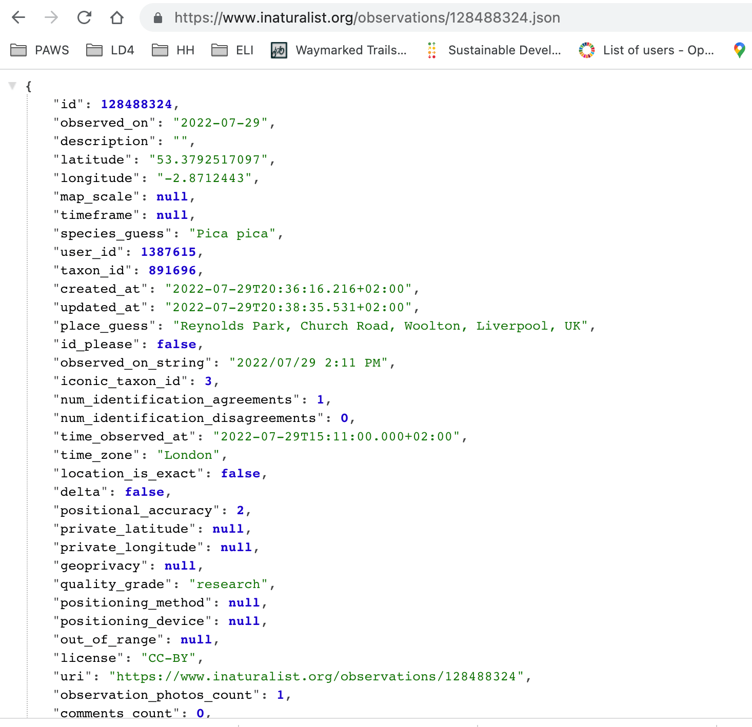 - hur vi gjort det mellan Wikidata och iNaturlist och jag i filmen hämtar en bild på en Skata som har fri licens, har klassificering, har kvalitet Research Grade och bilden togs i veckan i Liverpool och med 2 klick importeras den till Wikis bild databas