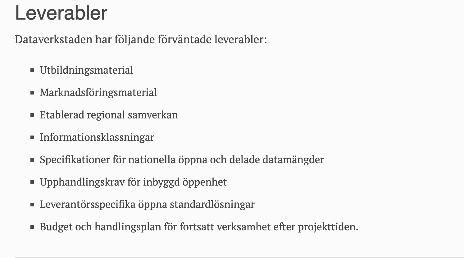 Ni har ju gott om projektmedel kvar, GitHub är gratis. Kolla hur @Magnus-Sälgö arbetar med GitHub, t.ex. badplatser och utegym. Där har ni mycket material ni kan lära av. Kolla också på hur NOSAD arbetar med öppen dialog.Om du orkar läsa alla trådar om datadelning här på forumet, så märker du att det finns en frustration kring arbetet med "specifikationer". Inte med antalet öppna data mängder. Att bara räkna antalet publicerade öppna datamängder leder till fina priser och utmärkelser, inte till samhällsnytta, Samhället behöver öppna data, som är kvalitetssäkrade, förvaltade, maskinläsbara och (framför allt) har tydliga informationsägare. Samma resonemang gäller själva specifikationerna och standarderna. Det blir orimligt att kommuner ska agera standardiseringsorgan. Om du följer tråden om badvatten, så ser du att ditt projekt eller kommunerna inte är ägare av nationella specifikationer (lagstadgad informationsägare). Om ni skapar egna specar, så motarbetar projektet arbetet med öppna data och Sverige kommer fortsätta fallet i rankingar.