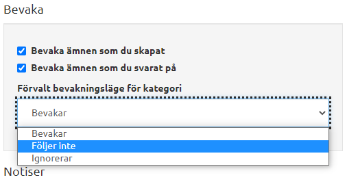 Den delen i inställningar som heter "Notiser" den bestämmer om och hur du vill få notiser i de kategorier du bevakar. "Bevaka" är det vill säga på kategorinivå och "Notiser" är på vilket sätt du vill få notiser för de bevakade kategorierna. Till exempel, om ett nytt ämne blir postat i en kategori som du bevakar så kommer du att få en notis/epost om detta beroende på dina notisinställningar.