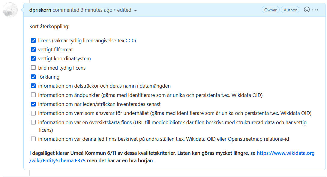 @Dennis_Priskorn exakt vad är det ni saknar i Umeås data? Dvs på vilket sätt kan vi i Umeå göra denna datamängd bättre? Jag är inte informationsägaren, men jag kan föra en vettig dialog med verksamheten som äger denna information och se om det finns möjlighet för oss att tillföra den information ni anser saknas för att det ska bli bättre. Har försökt följa tråden nedan, men lyckas inte utifrån den se vad som ska tillföras. Kom även ihåg att det måste vara görbart inom den kommunala verksamheten, och rimligt att man lägger arbetstiden på det (dvs jag måste kunna motivera att vi ska göra detta, och vi måste ha informationen - det är Inte jag som är motståndaren).