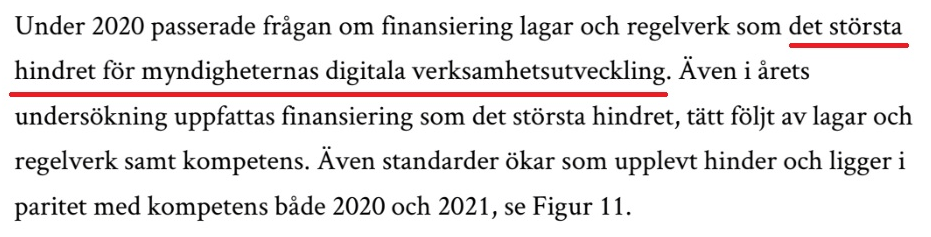 Jag kan inte bestämma mig för om det är plågsamt eller underhållande att höra departementens tjänstemän tala visionärt om AI och innovation, när de rimligen är fullt medvetna om att nyckeln till det ligger inlåst hos finansdepartementet. Nej, en myriad Vinnovaprojekt kommer inte lösa upp den här knuten, samhället får i stället en uppsjö "workarounds", som i förlängningen kommer bli oerhört kostnadsdrivande. Vet inte var idén att tillämpningar på taktisk nivå i form av Vinnovaprojekt skulle fungera har uppstått, märkligt är det...Men det handlar väl om att konsekvenserna av uteblivna resultat inte syns förrän åratal efter projektens slut (och alla projektrapporter redan konstaterat "Lyckat projekt", de brukar dessa rapporter alltid säga).