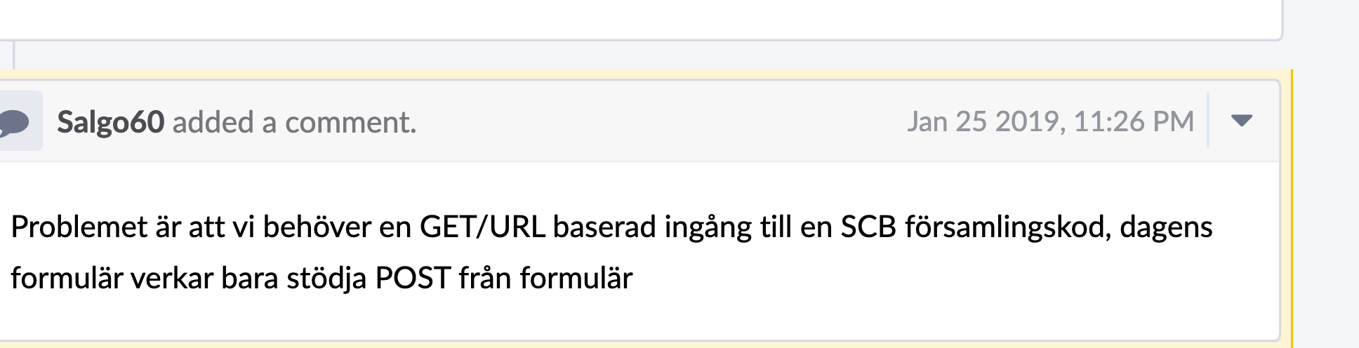 Så här behöver vi välja mellan två dåliga alternativ. Antingen bryta mot REST-principer och komplicera lösningen eller potentiellt exponera skyddsvärd information. I den sammanvägda bedömningen har vi landat i att skyddet är viktigare än principerna i detta fall och därför har vi ändrat till POST.