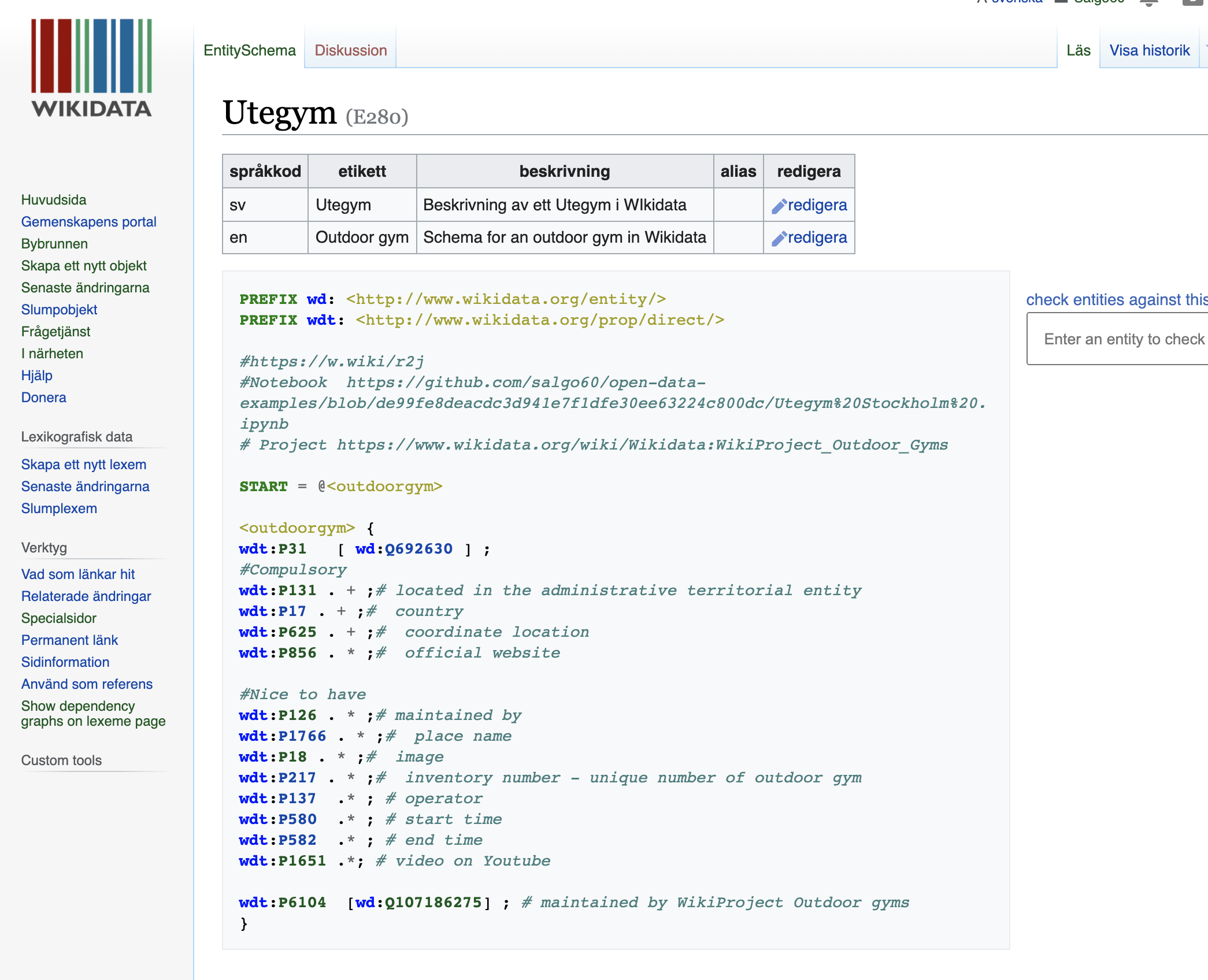 Roade mig med att återanvända definierade egenskaper i Wikidata och skapade ett enkelt utegym schema skrivet i ShEx tog 10 minuter lade sedan till 1200 svenska utegym / karta svenska / engelska jmf ovanstående specande i flera månader inget data....