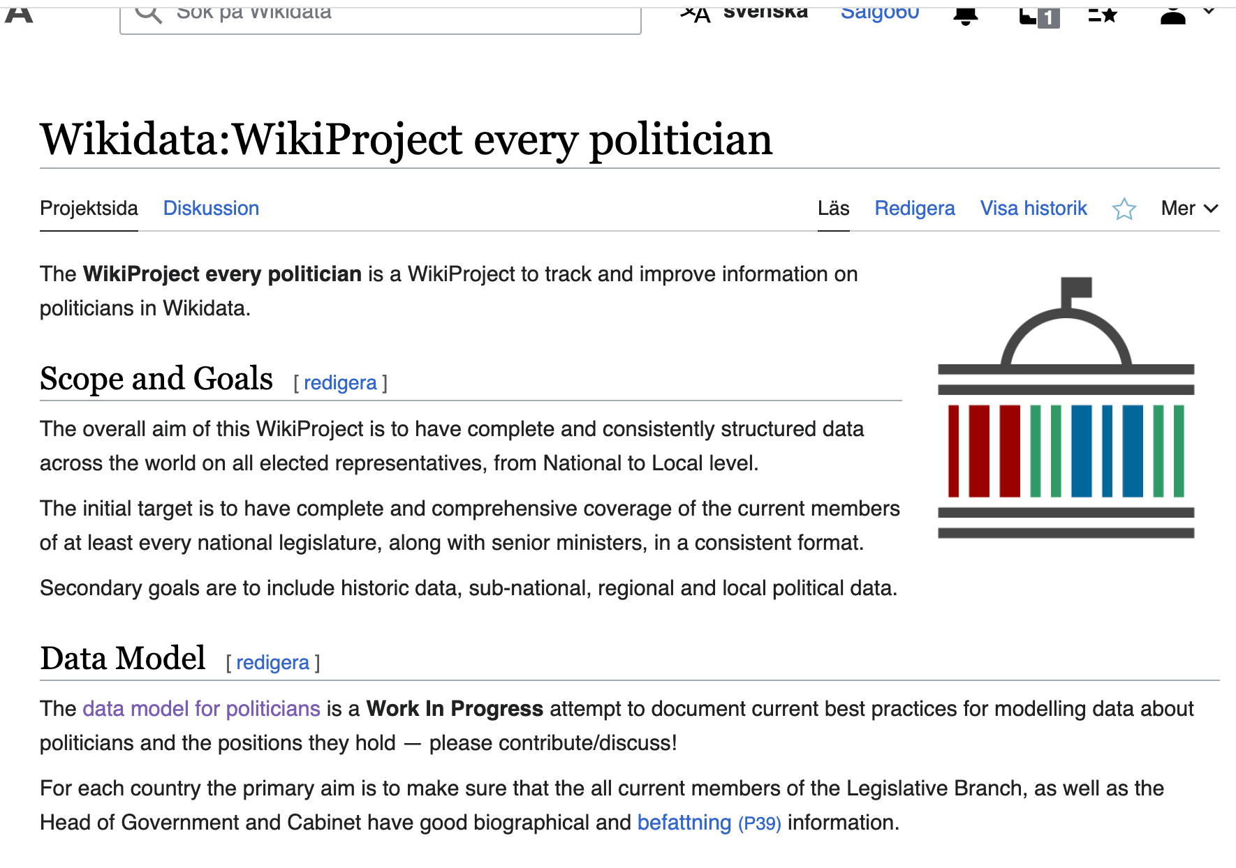 @Ainali har satt upp för Riksdagsdokument och Riksdagsledamöter hade vi data skulle vi kunna göra det för kommuner. Det Jan gör (och många flera bl.a. Datastory) är en del i att samla in alla världens politiker se Wikidata:WikiProject_every_politician