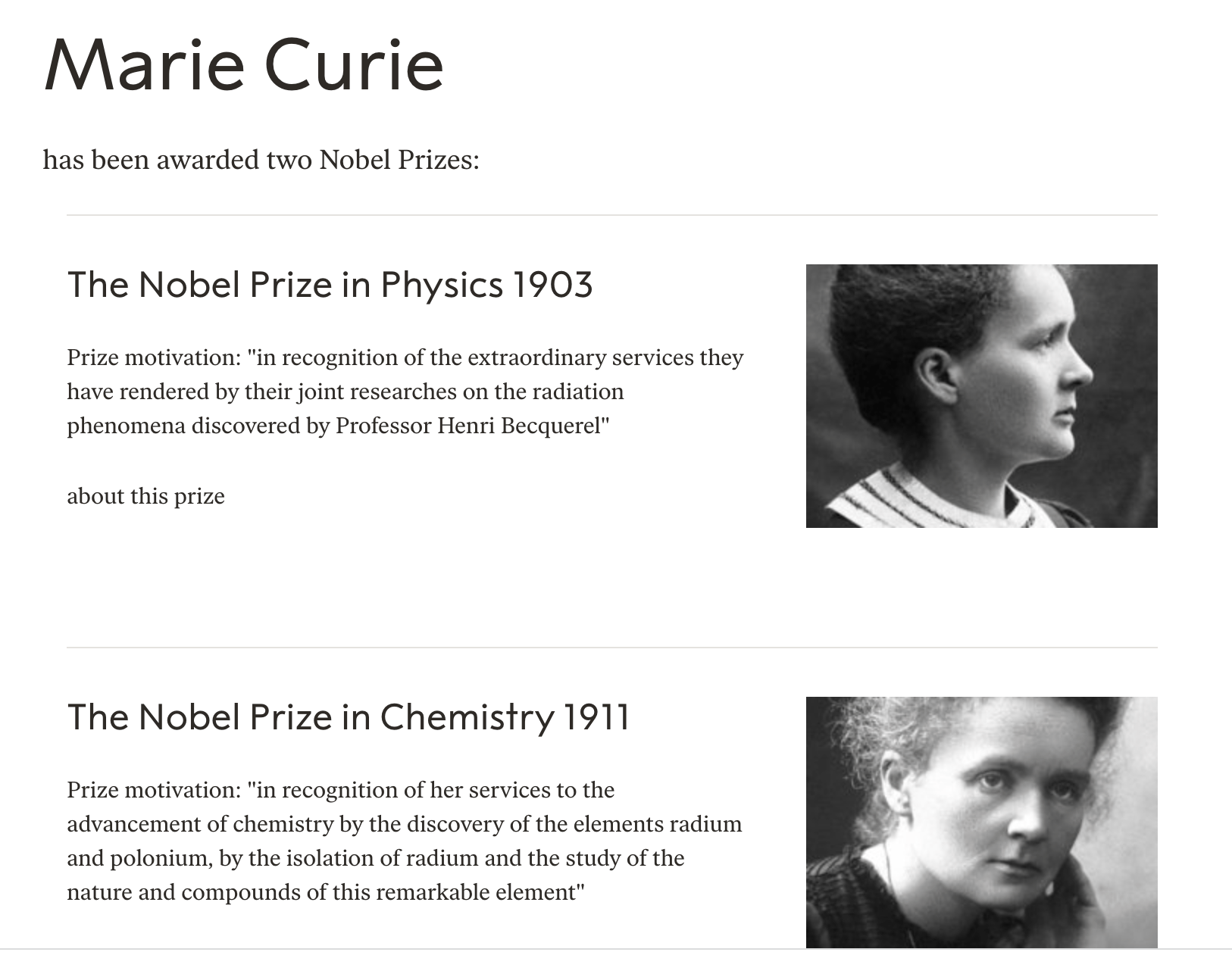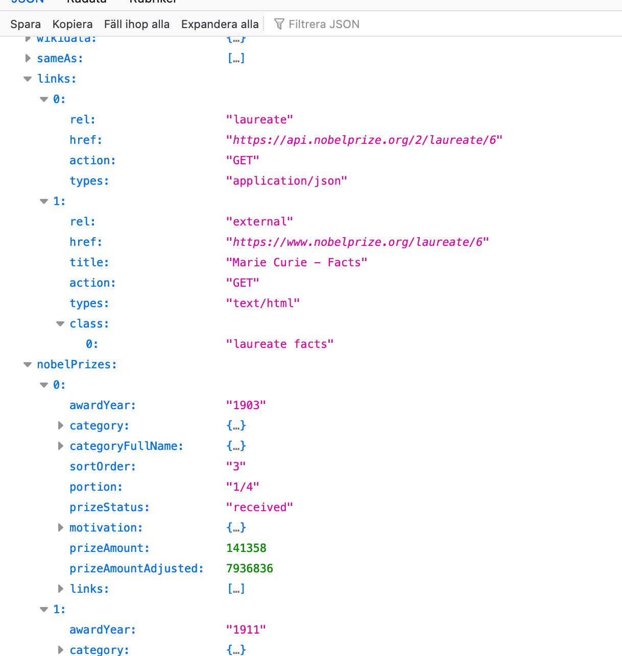 API Nobelsidan där Marie är nummer 6 men har 2 priser kopplat till sitt id