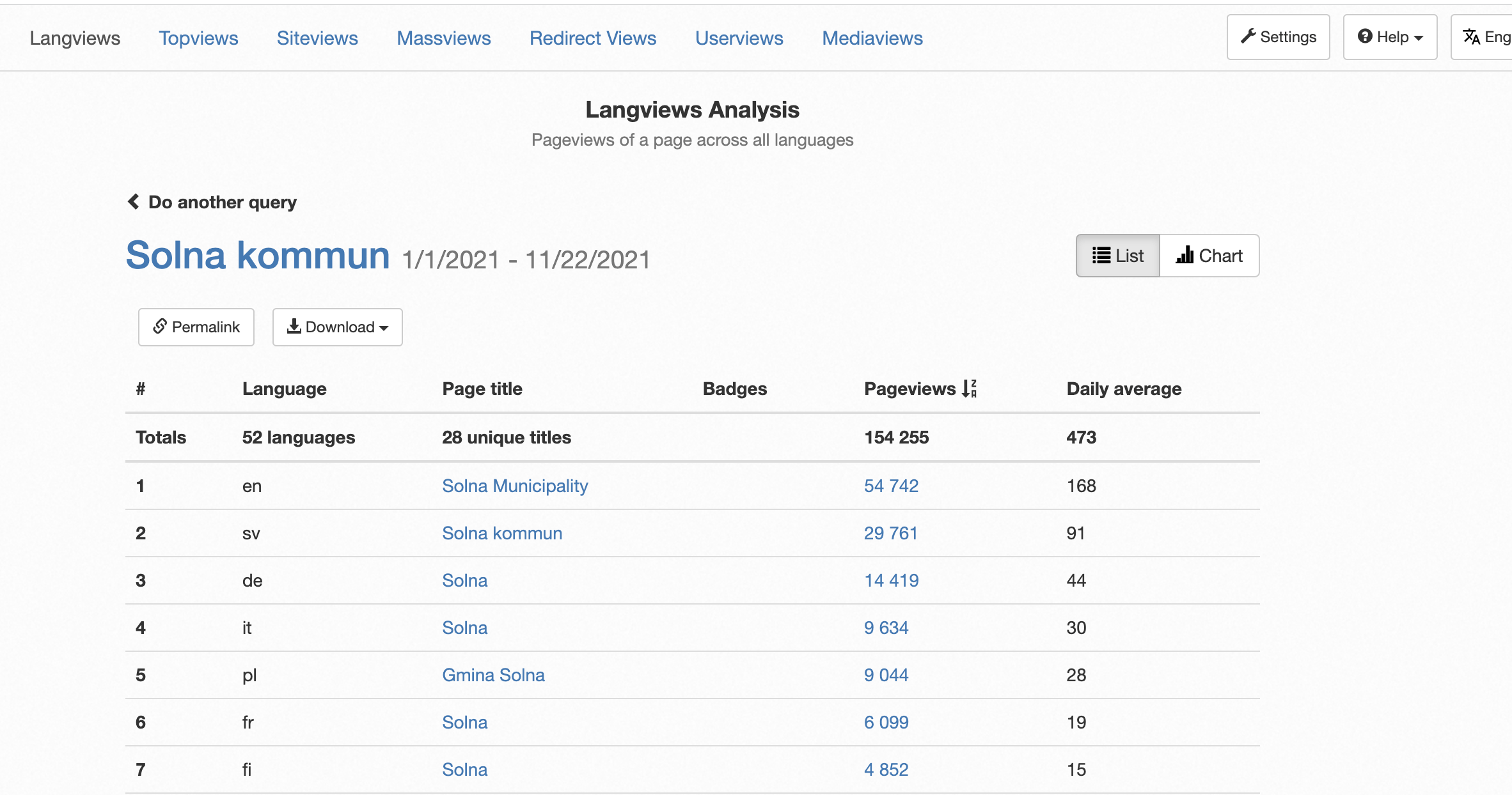 - jämförelse Solna kommun där vi har artiklar på 52 språk och antalet läsare i år är 54 742 på en:Wikipedia medans sv:Wikipedia har 29 761 länk statistik