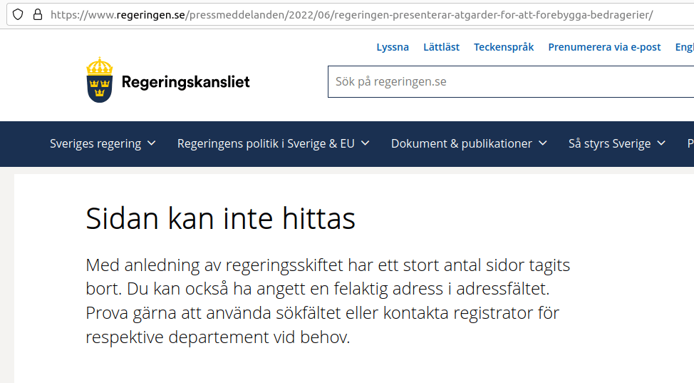 https://web.archive.org/web/20220728104602/https://regeringen.se/pressmeddelanden/2022/06/regeringen-presenterar-atgarder-for-att-forebygga-bedragerier/(Full disclosure: jag är inhyrd av teamet bakom denna arkivtjänst, se https://www.wikidata.org/wiki/Q111016131)
