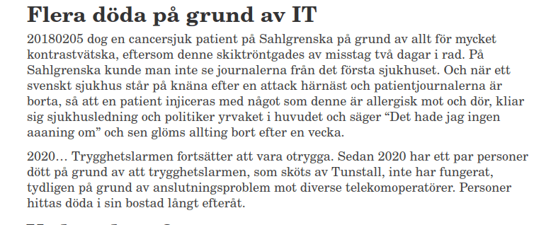 http://www.teknikaliteter.se/2021/11/05/it-skandaler-som-ingen-bryr-sig-om/Det finns för övrigt bra öppen källkod IT-system sen minst 14 år) för sjukhus, se tex https://en.wikipedia.org/wiki/GNU_Health och det används redan i produktion i Sydamerika. Den huvudansvariga intervjus här https://joinup.ec.europa.eu/collection/open-source-observatory-osor/news/interview-dr-luis-falcon-gnu-health