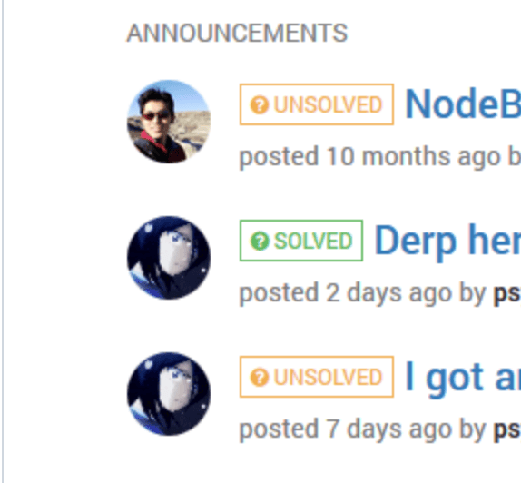 Trådar kan både startas som Frågor eller Questions som det kallas i den engelska versionen eller omvandlas efter skapande. Dessutom finns funktionen att en tråd har Resolvats av viss post och att den kommer högst upp (lite som Reddit).